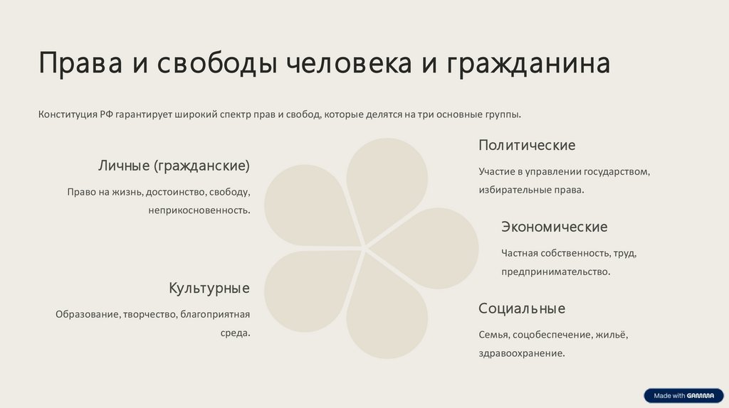 Права и свободы человека и гражданинаКонституция РФ гарантирует широкий спектр прав и свобод, которые делятся на три основные группы.