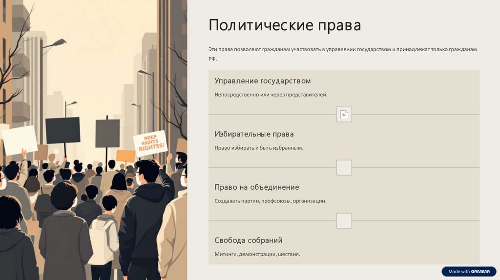 Пол итические праваЭти права позволяют гражданам участвовать в управлении государством и принадлежат только гражданам