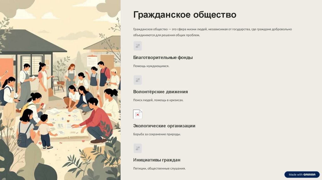 Гражданское обществоГражданское общество — это сфера жизни людей, независимая от государства, где граждане добровольно