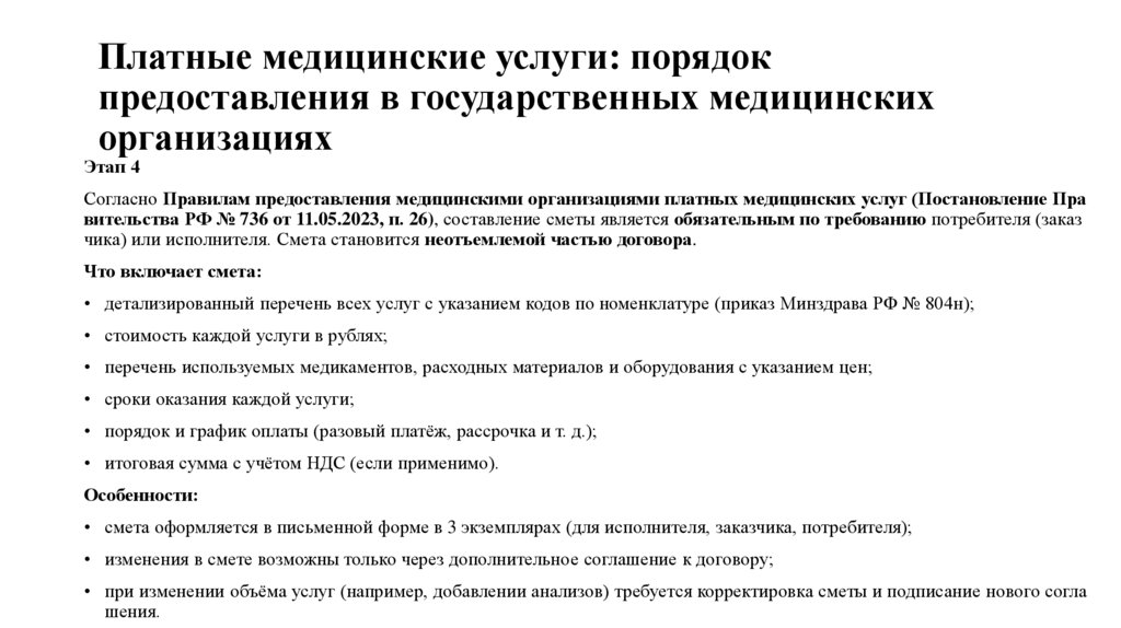 • Постановление Правительства РФ от 11.05.2023 № 736 «Об утвержденииПравил предоставления медицинскими организациями платных медицински