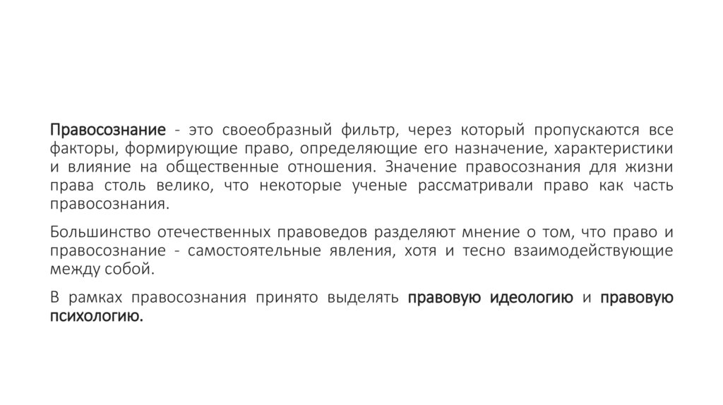 Правосознание - это своеобразный фильтр, через который пропускаются всефакторы, формирующие право, определяющие его назначение, характеристики