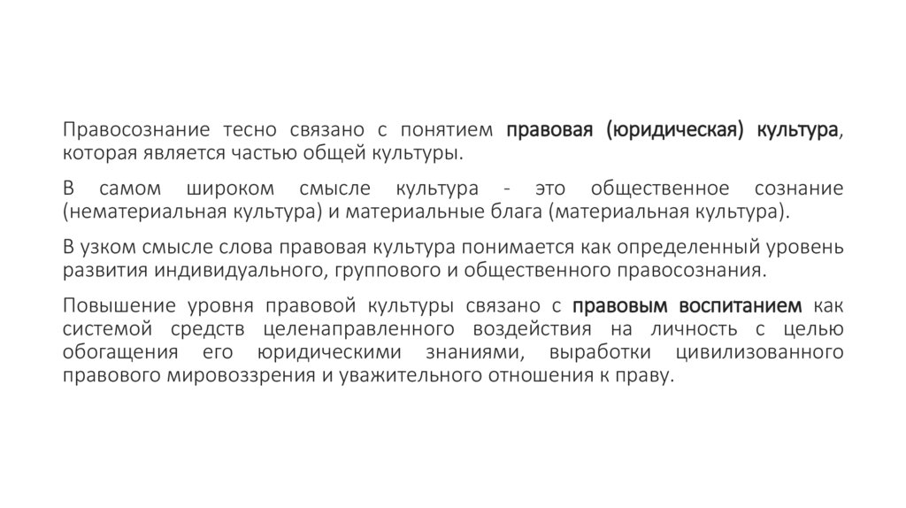Правосознание тесно связано с понятием правовая (юридическая) культура,которая является частью общей культуры.