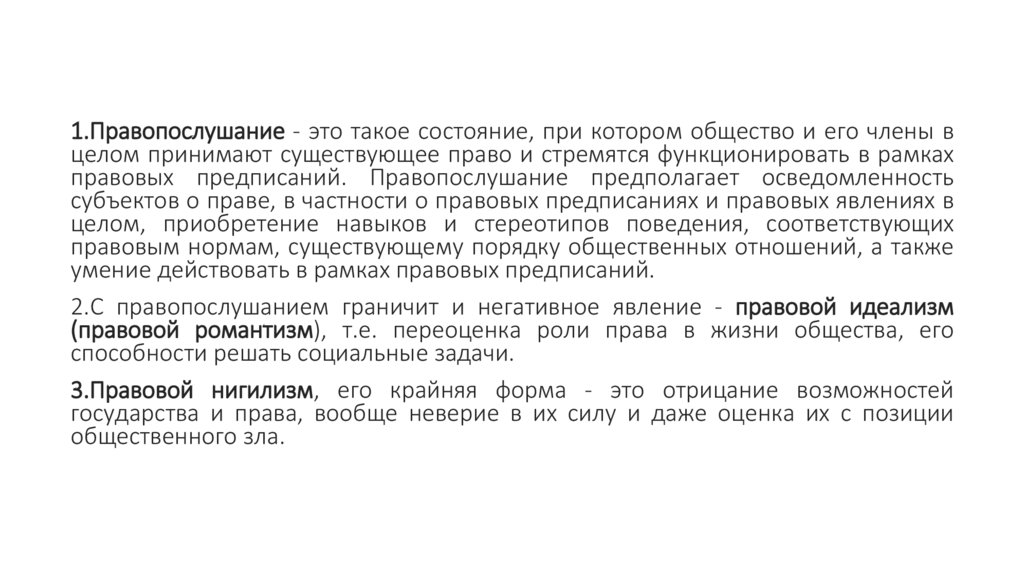 1.Правопослушание - это такое состояние, при котором общество и его члены вцелом принимают существующее право и стремятся функционировать в рамках