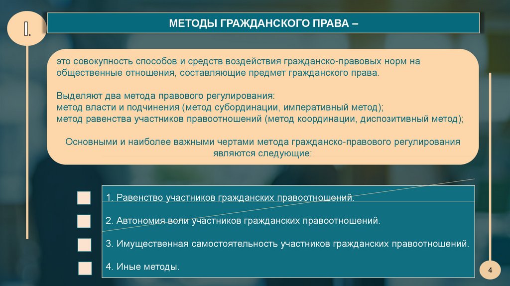 МЕТОДЫ ГРАЖДАНСКОГО ПРАВА –это совокупность способов и средств воздействия гражданско-правовых норм на