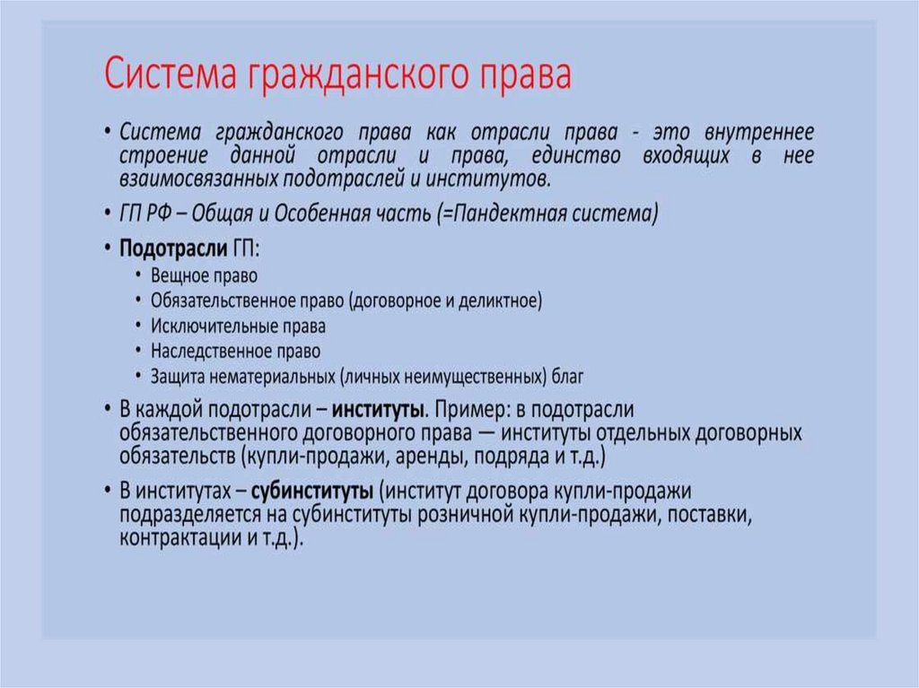 Под системой гражданского права понимается совокупность гражданско-правовыхнорм, юридических институтов, субинститутов, общей части и подотраслей гражданского