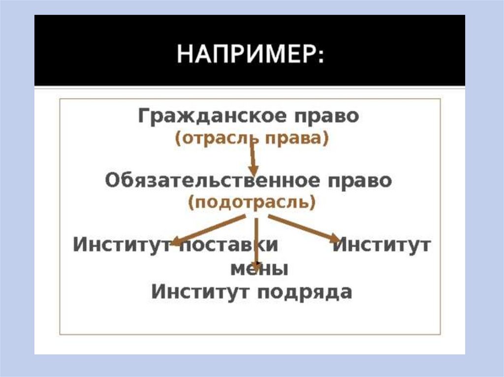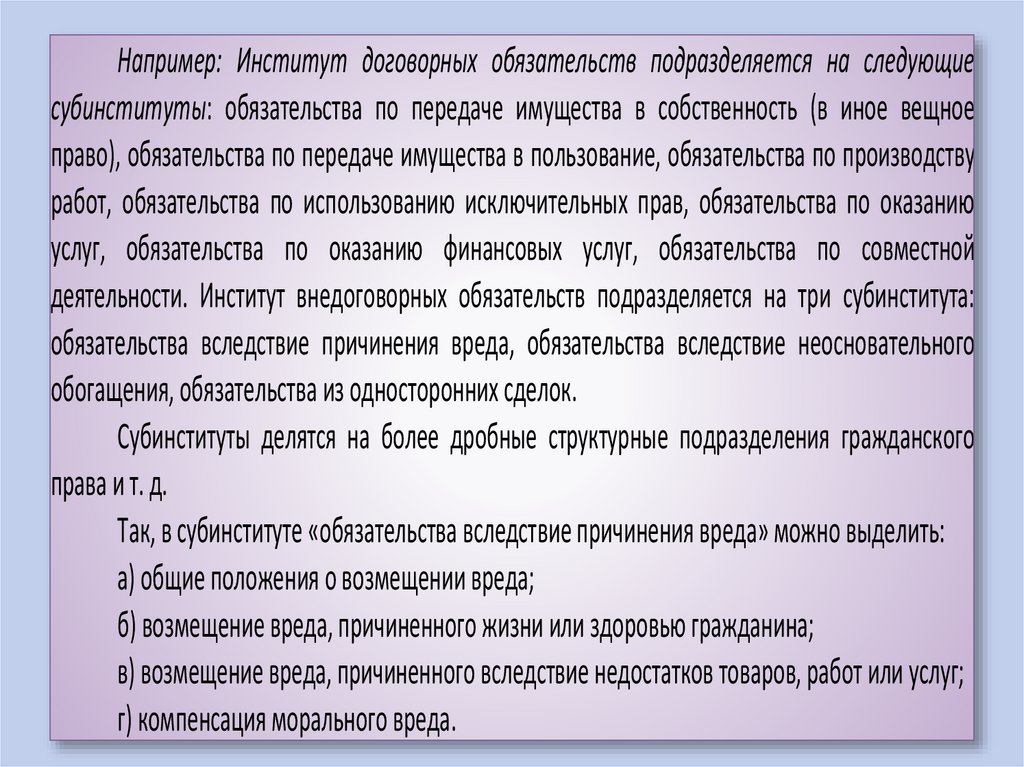 Например: Институт договорных обязательств подразделяется на следующиесубинституты: обязательства по передаче имущества в собственность (в иное вещное