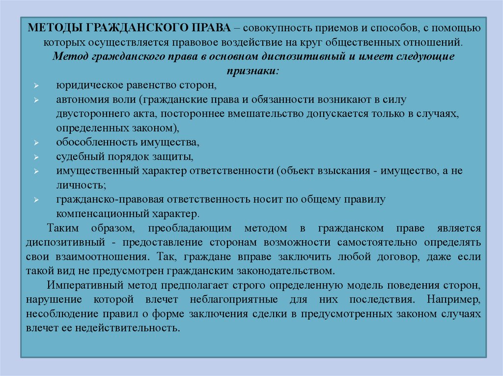 Метод гражданского права в основном диспозитивный и имеет следующие