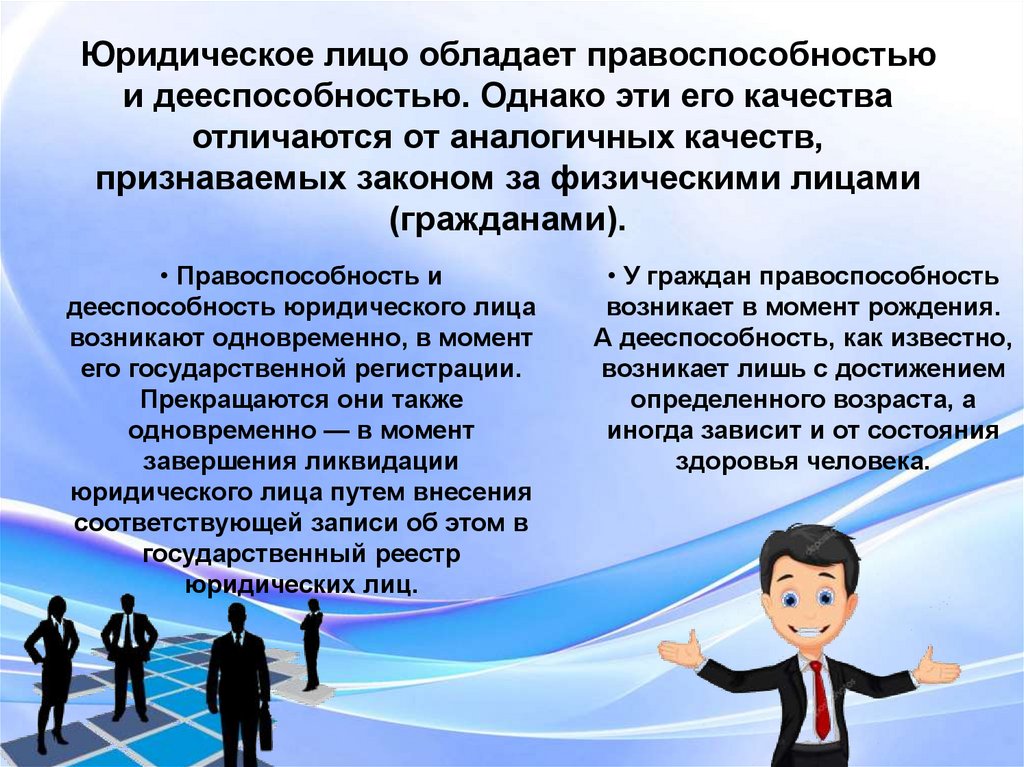 Юридическое лицо обладает правоспособностьюи дееспособностью. Однако эти его качества