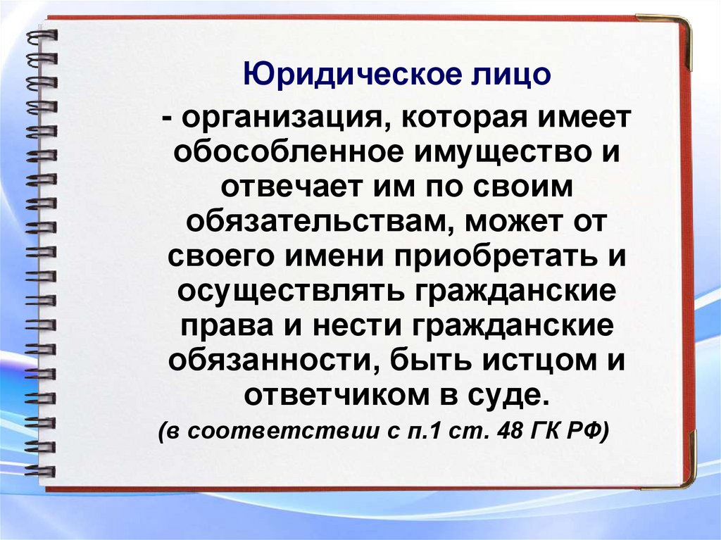 Юридическое лицо- организация, которая имеет