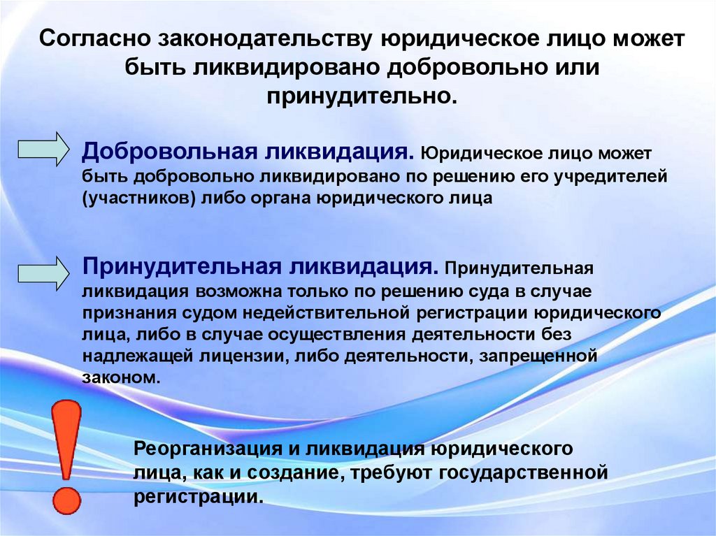 Согласно законодательству юридическое лицо можетбыть ликвидировано добровольно или