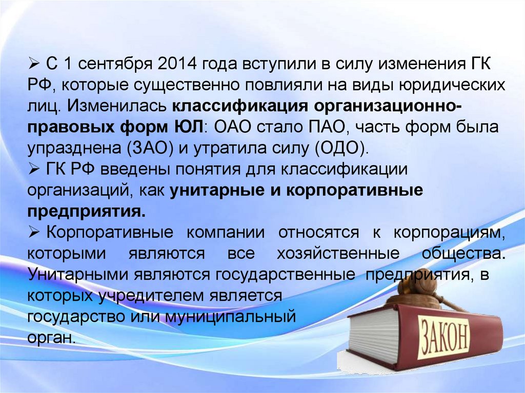 лиц. Изменилась классификация организационноправовых форм ЮЛ: ОАО стало ПАО, часть форм была