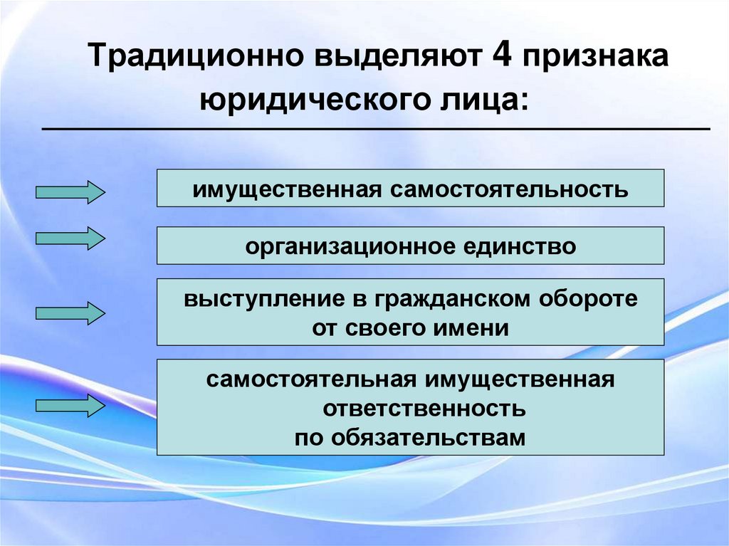 Традиционно выделяют 4 признакаюридического лица: