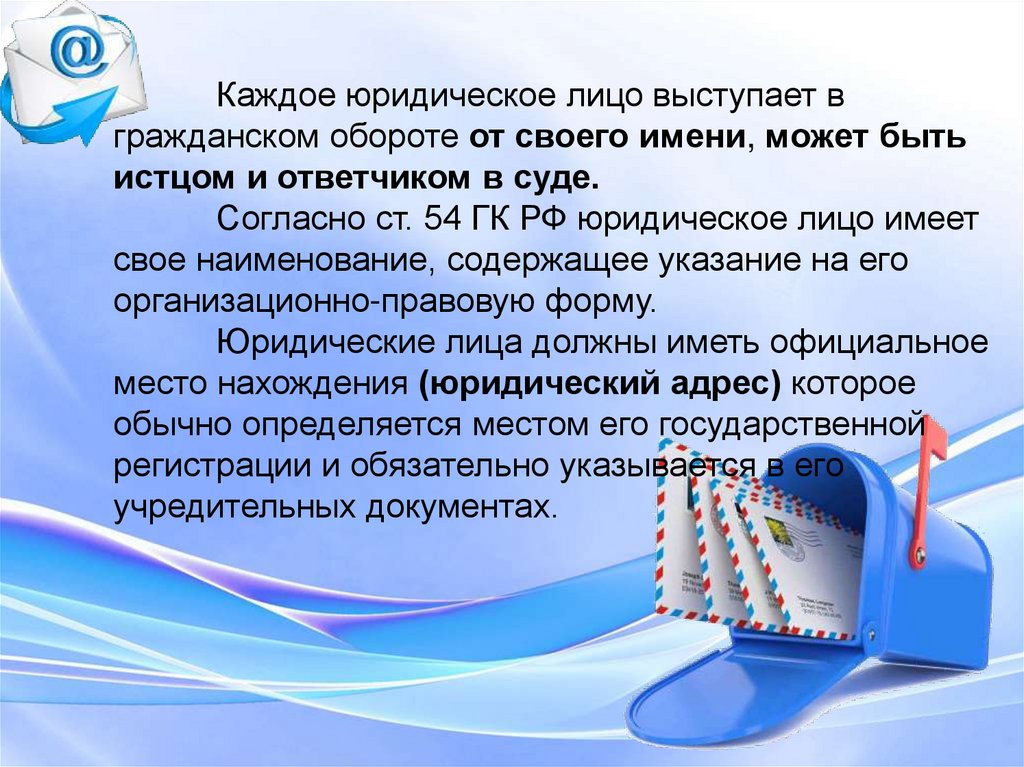 Согласно ст. 54 ГК РФ юридическое лицо имеет