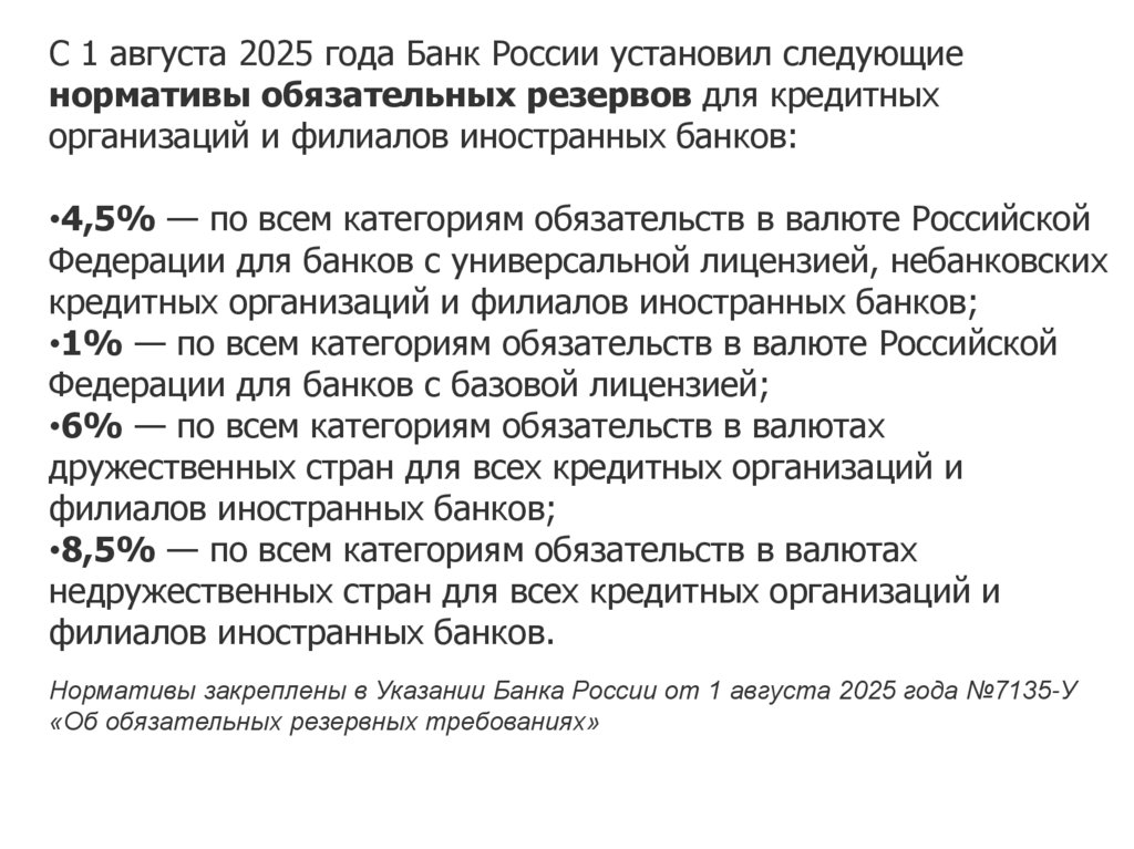 С 1 августа 2025 года Банк России установил следующиенормативы обязательных резервов для кредитных
