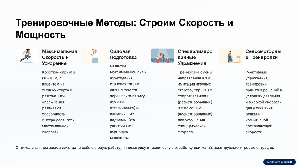 Основные направления: развитие силы и мощности через силовые упражнения и плиометрику, а также техническая