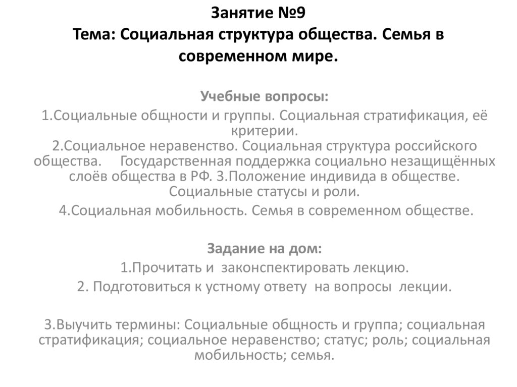 1. Занятие №9 Тема: Социальная структура общества. Семья в современном мире.