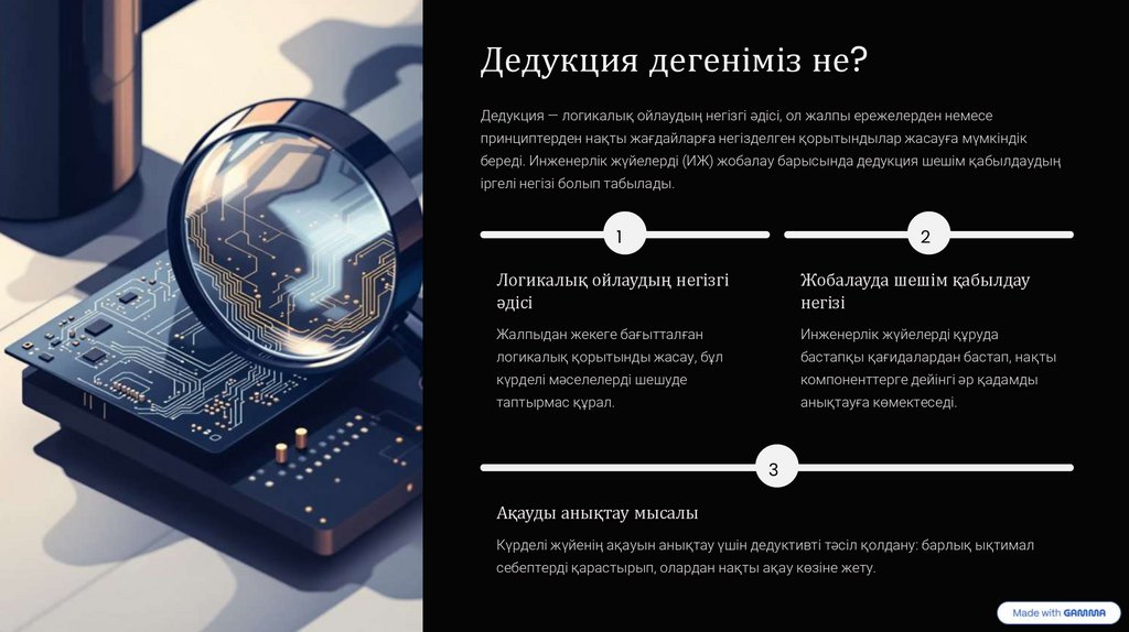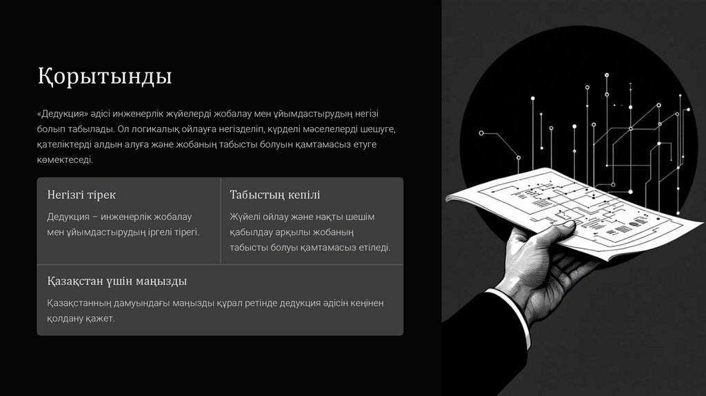 Қорытынды«Дедукция» әдісі инженерлік жүйелерді жобалау мен ұйымдастырудың негізі