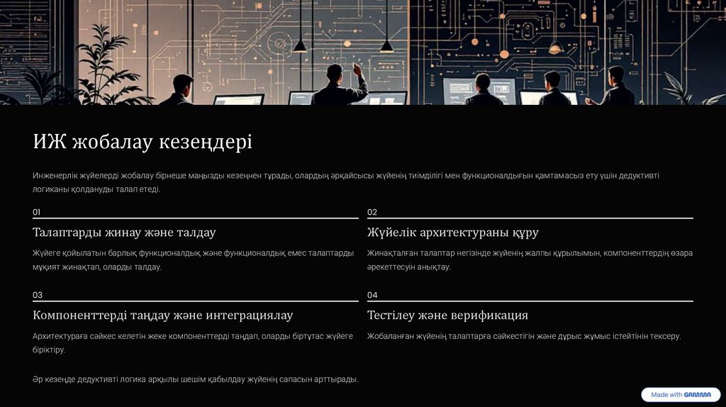 ИЖ жобалау кезеңдеріИнженерлік жүйелерді жобалау бірнеше маңызды кезеңнен тұрады, олардың әрқайсысы жүйенің тиімділігі мен функционалдығын қамтамасыз ету үшін дедуктивті