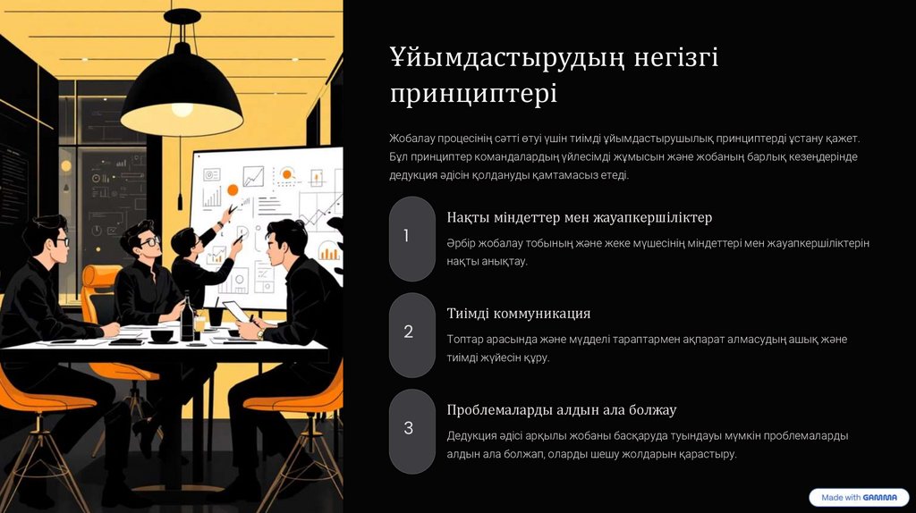 Жобалау процесінің сәтті өтуі үшін тиімді ұйымдастырушылық принциптерді ұстану қажет.