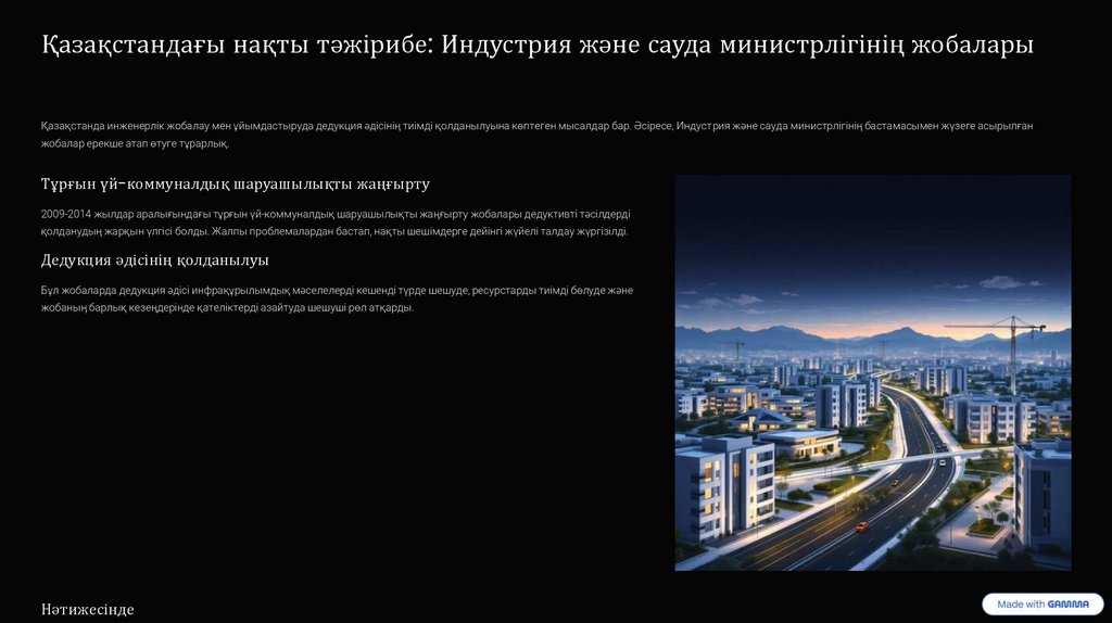 Қазақстандағы нақты тәжірибе: Индустрия және сауда министрлігінің жобаларыҚазақстанда инженерлік жобалау мен ұйымдастыруда дедукция әдісінің тиімді қолданылуына көптеген мысалдар бар. Әсіресе, Индустрия және сауда министрлігінің бастамасымен жүзеге асырылған