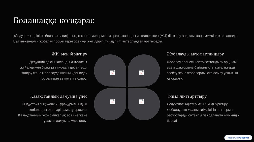 Болашаққа көзқарас«Дедукция» әдісінің болашағы цифрлық технологиялармен, әсіресе жасанды интеллектпен (ЖИ) біріктіру арқылы жаңа мүмкіндіктер ашады.