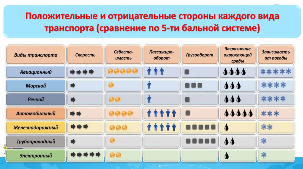 Положительные и отрицательные стороны каждого видатранспорта (сравнение по 5-ти бальной системе)