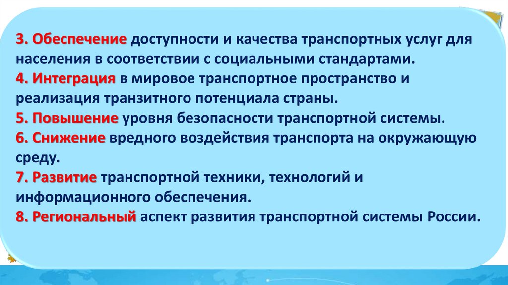 3. Обеспечение доступности и качества транспортных услуг длянаселения в соответствии с социальными стандартами.