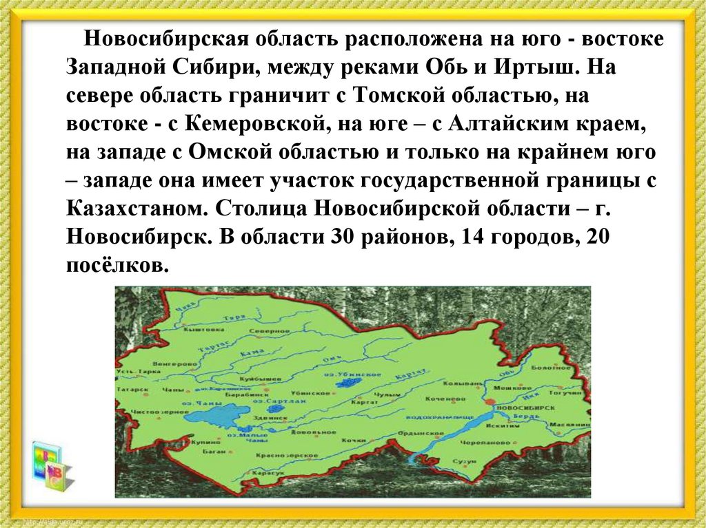 Новосибирская область расположена на юго - востокеЗападной Сибири, между реками Обь и Иртыш. На
