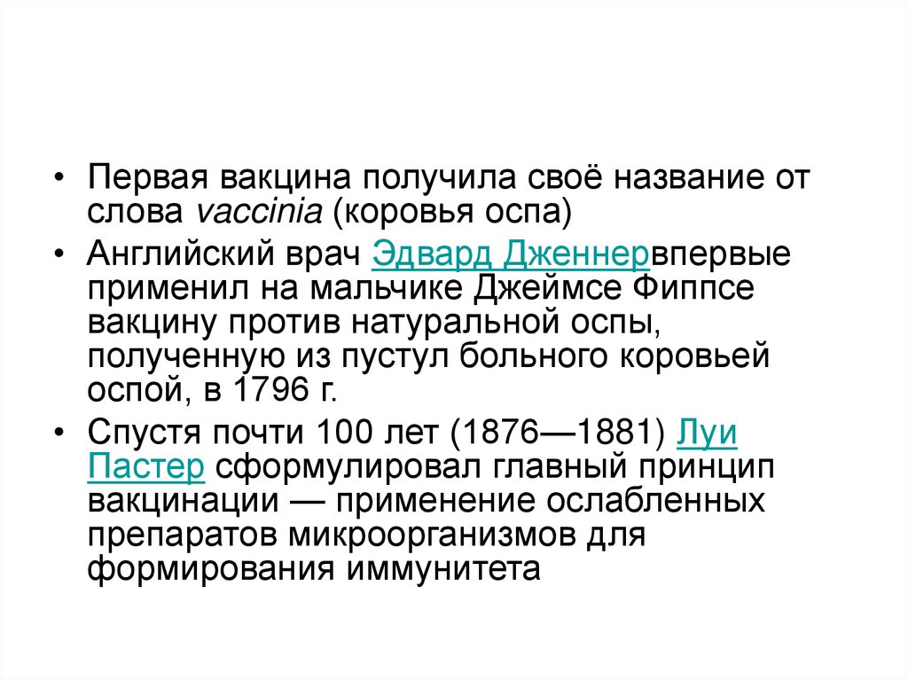 • Первая вакцина получила своё название отслова vaccinia (коровья оспа)