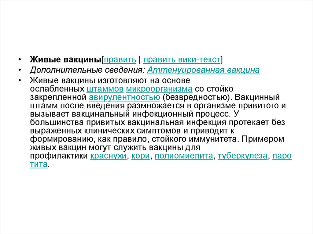 • Живые вакцины[править | править вики-текст]• Дополнительные сведения: Аттенуированная вакцина