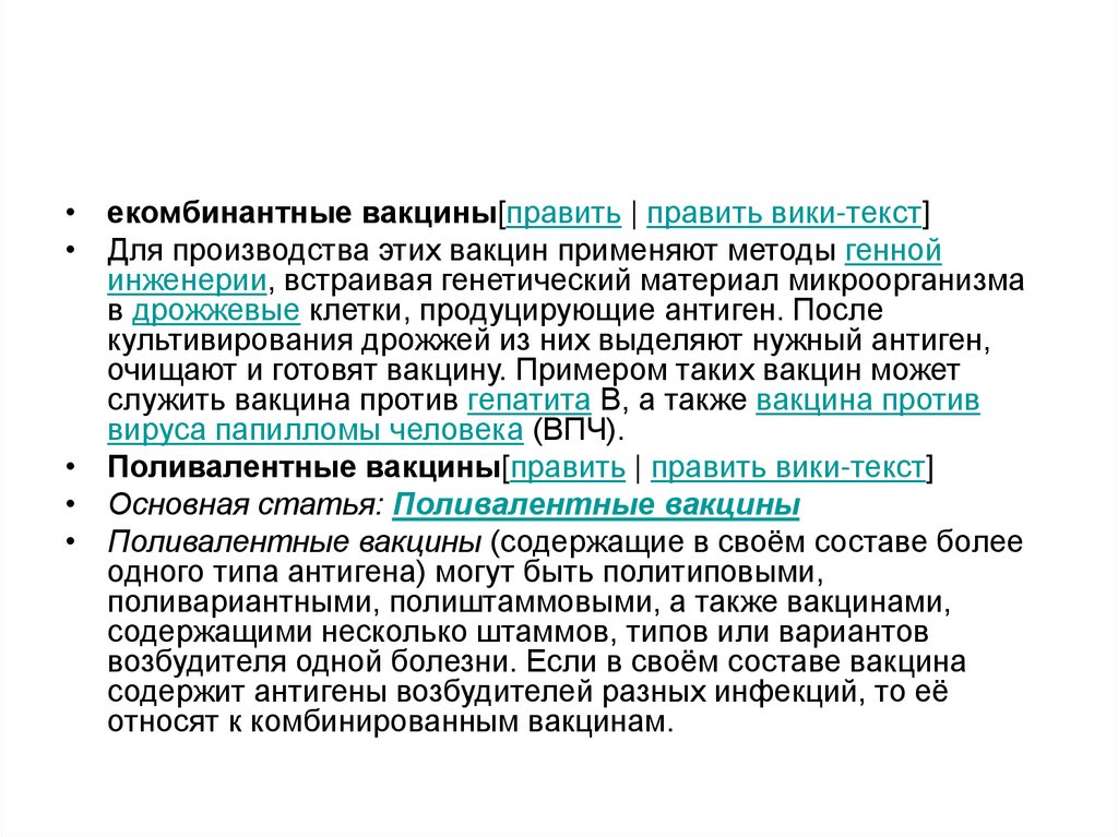 • екомбинантные вакцины[править | править вики-текст]• Для производства этих вакцин применяют методы генной