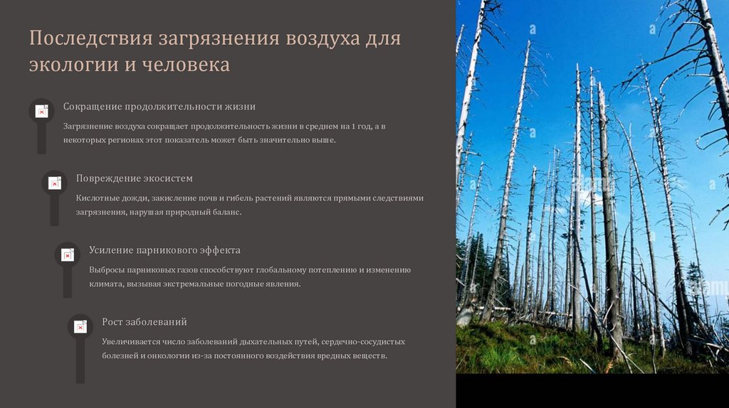 Кислотные дожди, закисление почв и гибель растений являются прямыми следствиями
