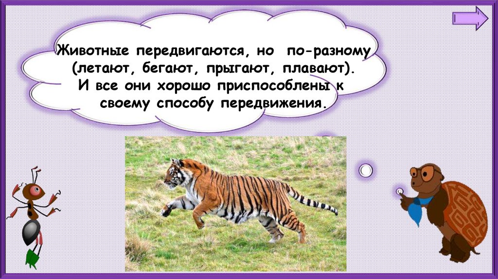 Животные передвигаются, но по-разному(летают, бегают, прыгают, плавают).