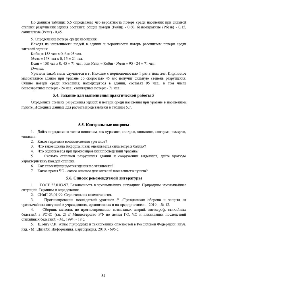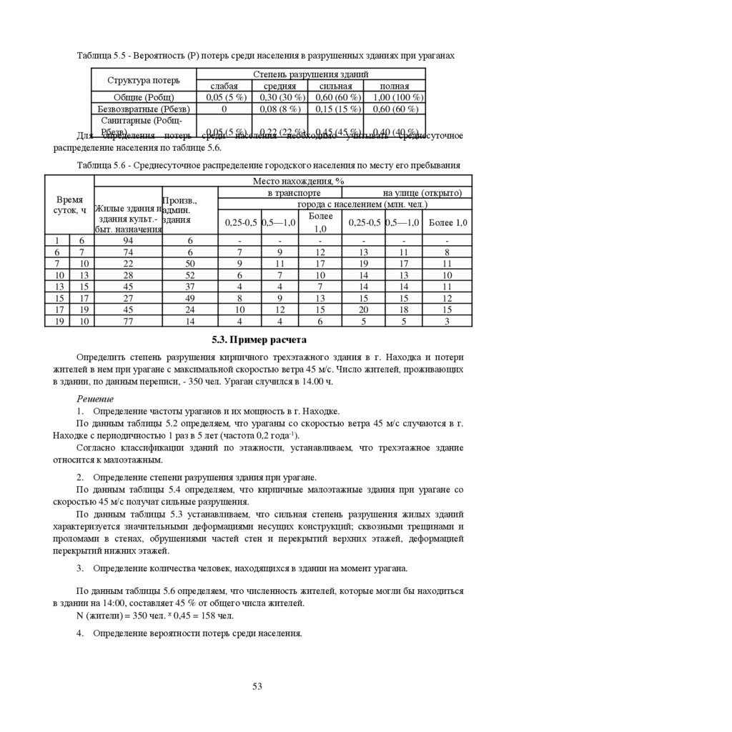 По данным таблицы 5.5 определяем, что вероятность потерь среди населения при сильнойстепени разрушения здания составит: общие потери (Робщ) - 0,60, безвозвратные (Рбезв) - 0,15,
