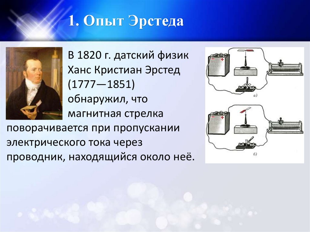 1. Опыт ЭрстедаВ 1820 г. датский физик