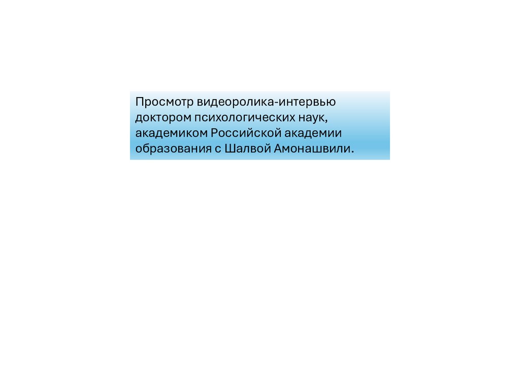 Просмотр видеоролика-интервью доктором психологических наук, академиком Российской академии образования с Шалвой Амонашвили.Просмотр видеоролика-интервью