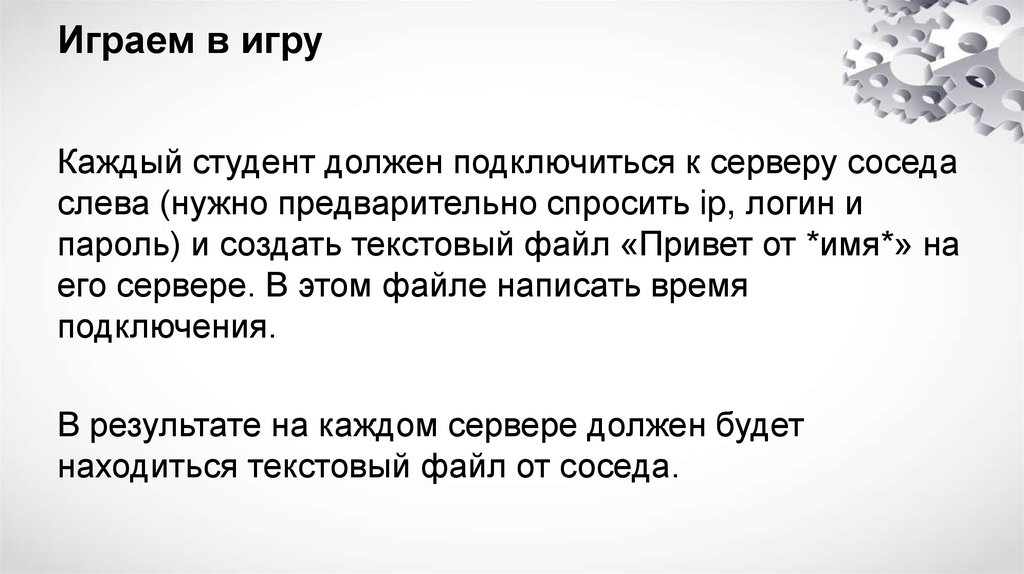 Играем в игруКаждый студент должен подключиться к серверу соседа