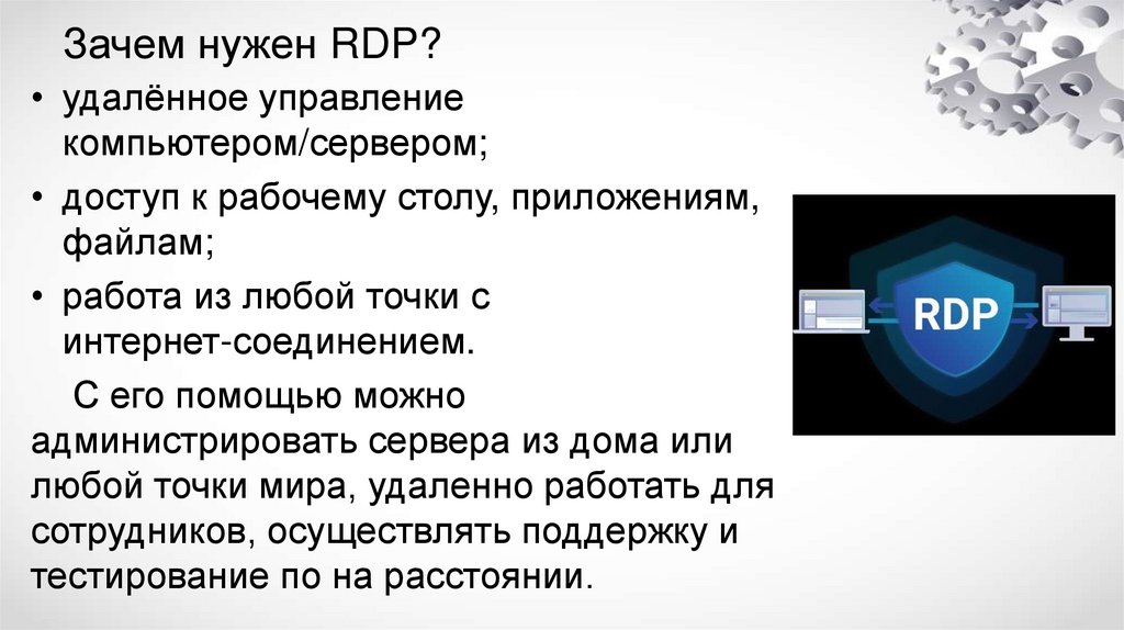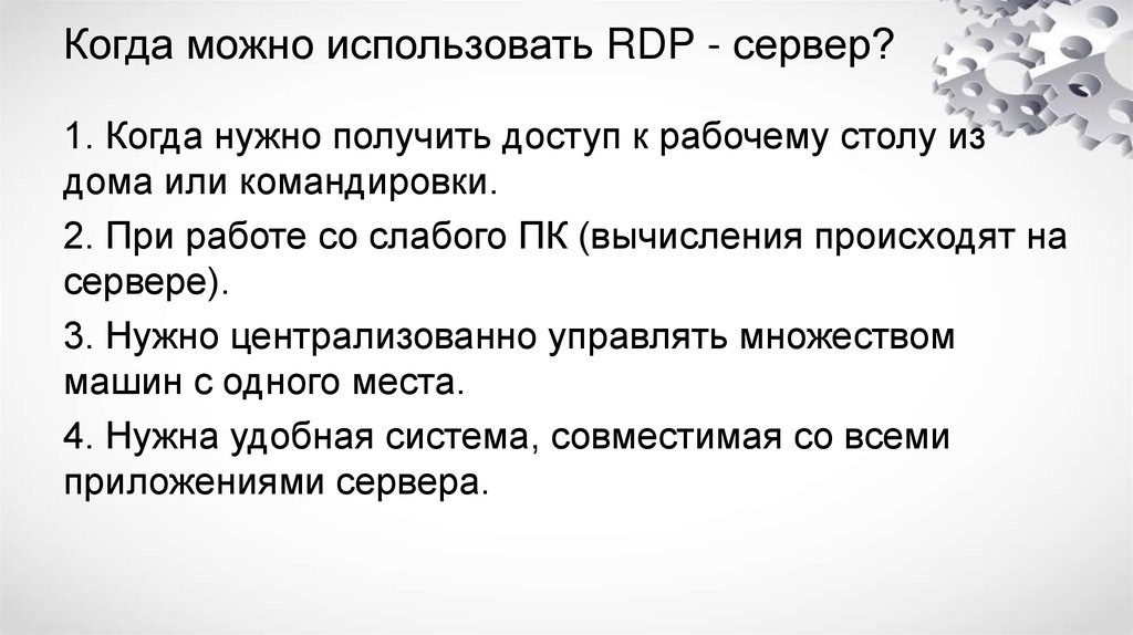Когда можно использовать RDP - сервер?1. Когда нужно получить доступ к рабочему столу из