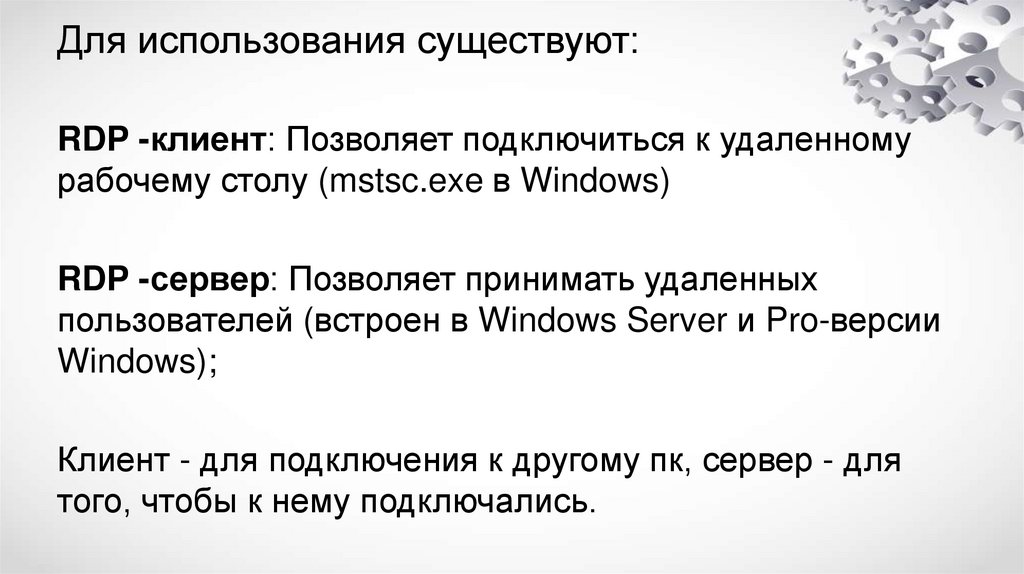 Для использования существуют:RDP -клиент: Позволяет подключиться к удаленному