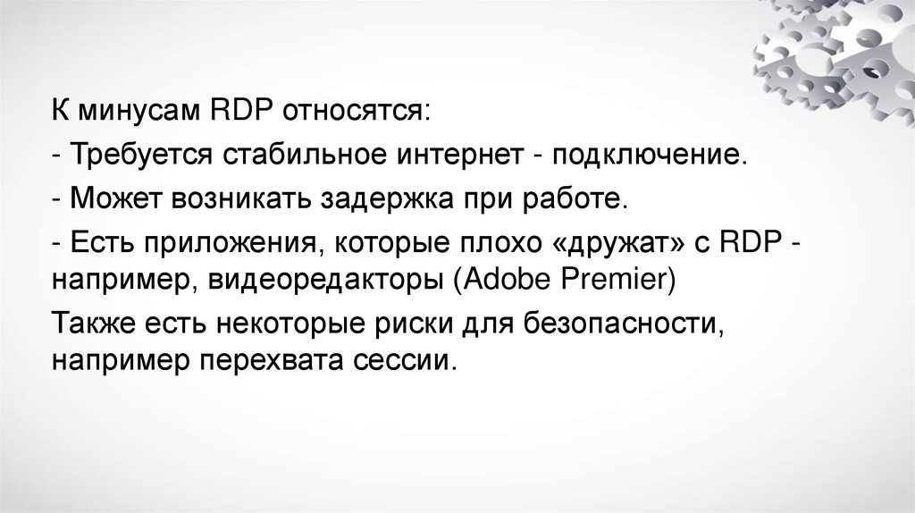 К минусам RDP относятся:- Требуется стабильное интернет - подключение.