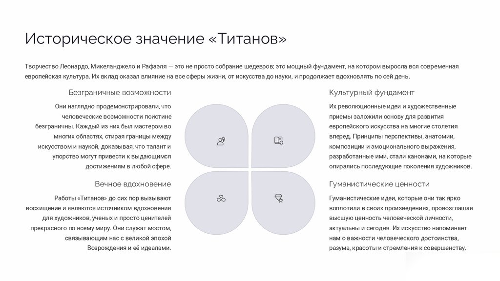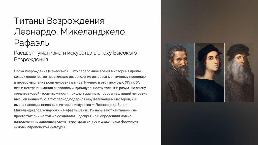 Историческое значение «Титанов»Творчество Леонардо, Микеланджело и Рафаэля — это не просто собрание шедевров; это мощный фундамент, на котором выросла вся современная