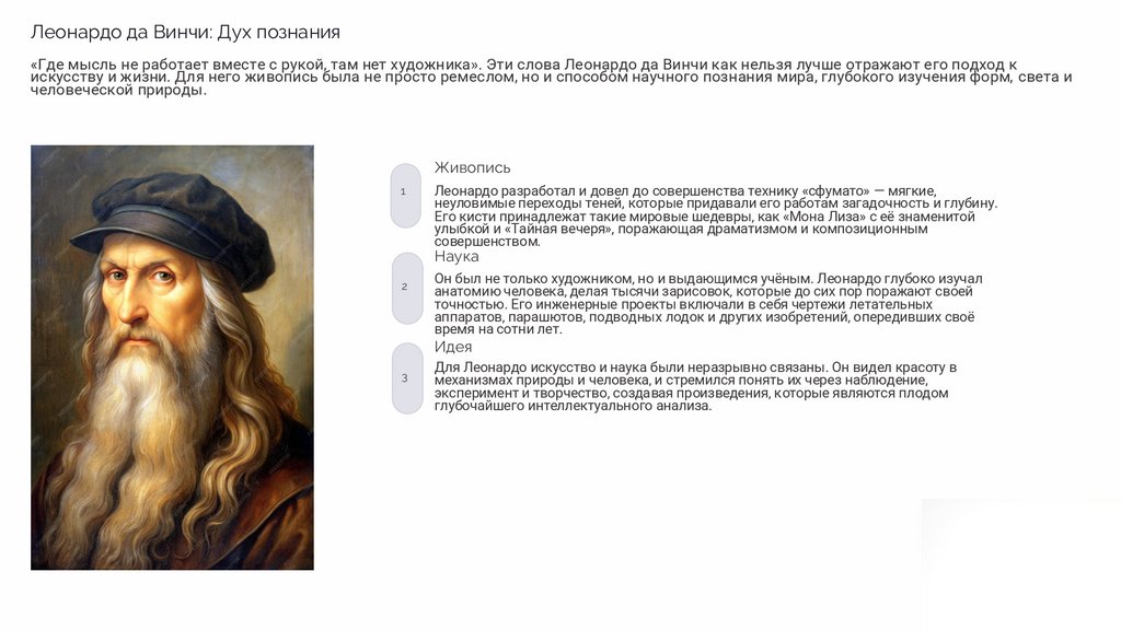 Леонардо да Винчи: Дух познания«Где мысль не работает вместе с рукой, там нет художника». Эти слова Леонардо да Винчи как нельзя лучше отражают его подход к