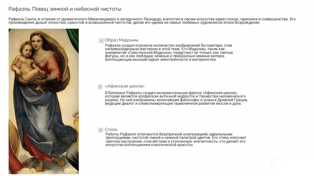 произведения дышат ясностью, красотой и возвышенной чистотой, делая его одним из самых любимых художников эпохи Возрождения.