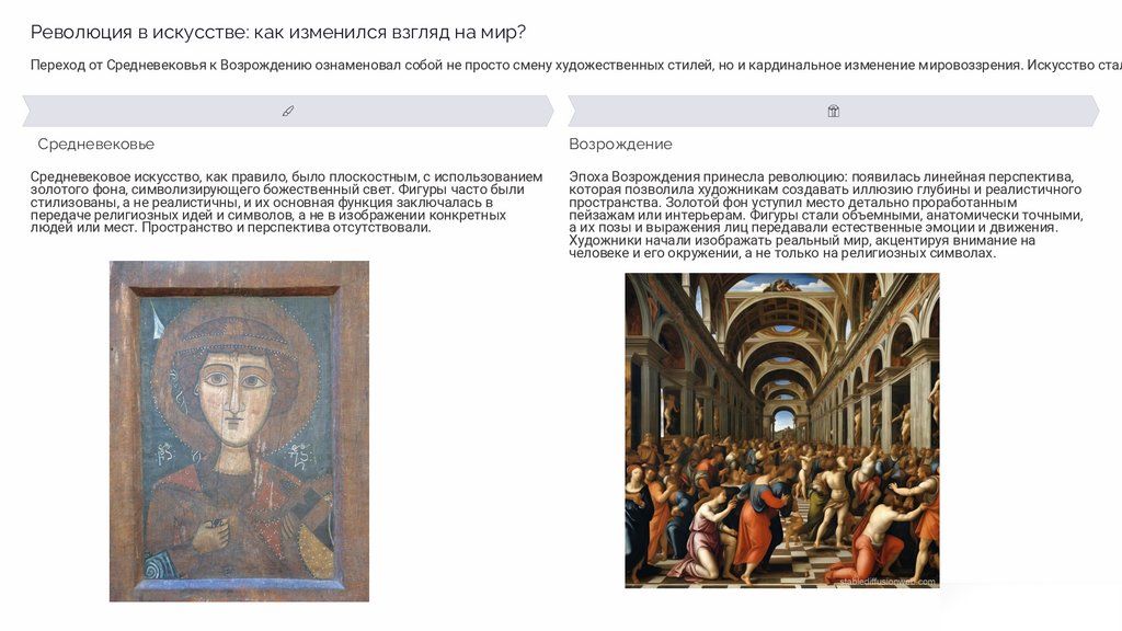 Революция в искусстве: как изменился взгляд на мир?Переход от Средневековья к Возрождению ознаменовал собой не просто смену художественных стилей, но и кардинальное изменение мировоззрения. Искусство стал