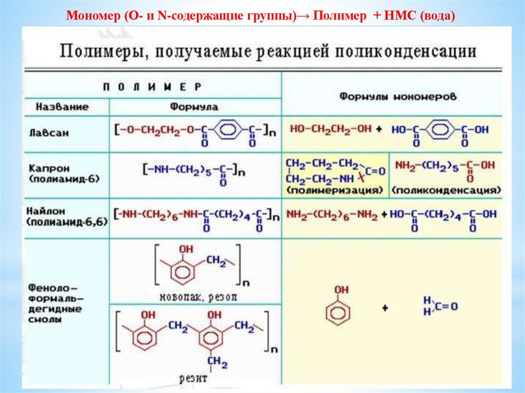 Мономер (О- и N-содержащие группы)→ Полимер + НМС (вода)