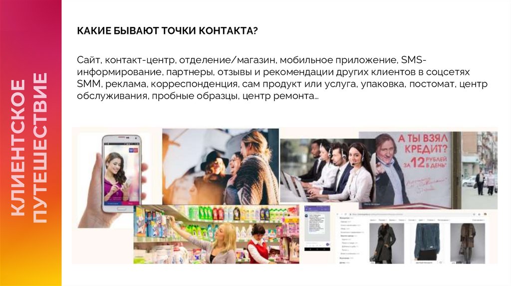 Сайт, контакт-центр, отделение/магазин, мобильное приложение, SMSинформирование, партнеры, отзывы и рекомендации других клиентов в соцсетях