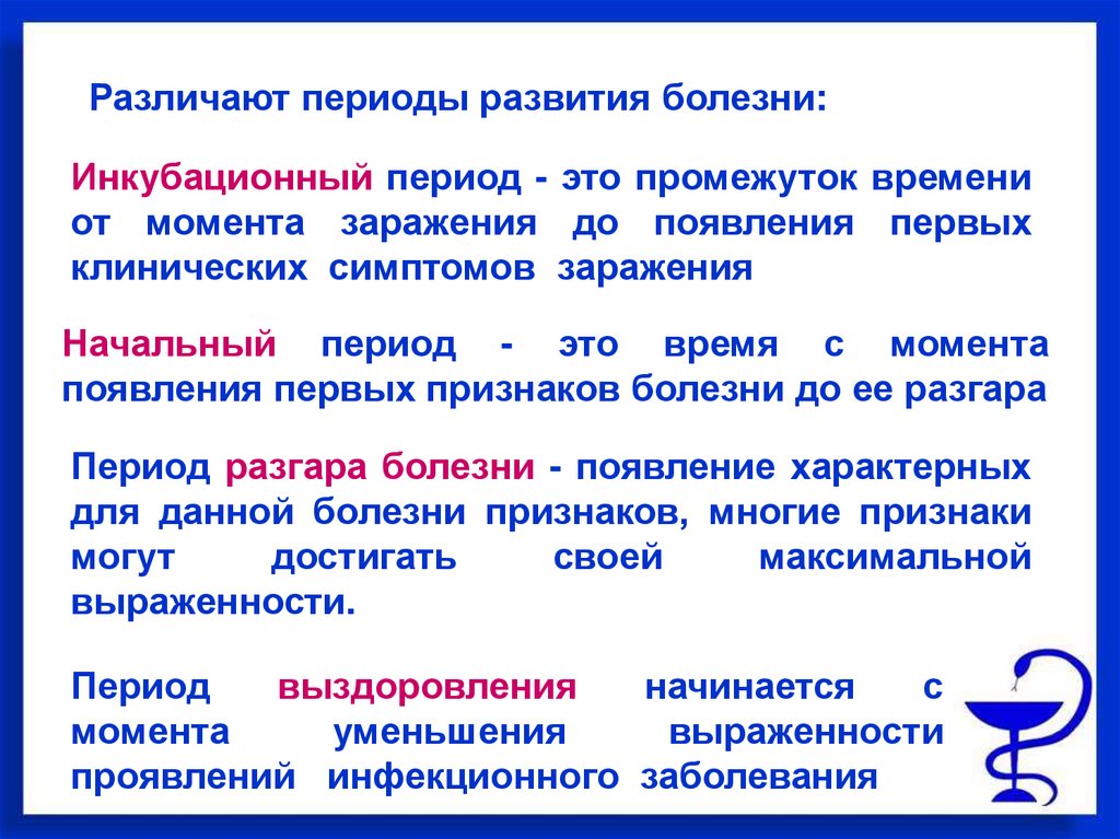 Различают периоды развития болезни:Инкубационный период - это промежуток времени