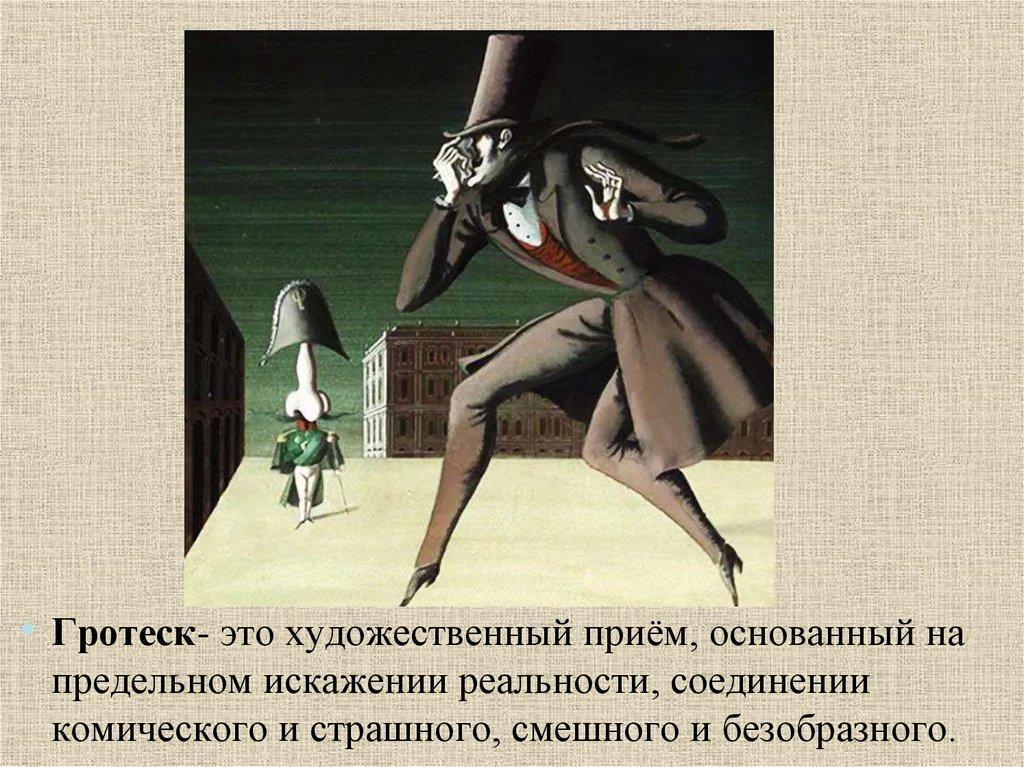 • Гротеск- это художественный приём, основанный напредельном искажении реальности, соединении