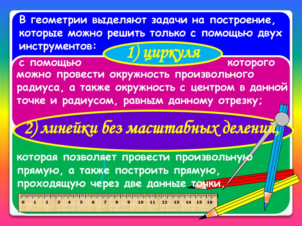 В геометрии выделяют задачи на построение,которые можно решить только с помощью двух