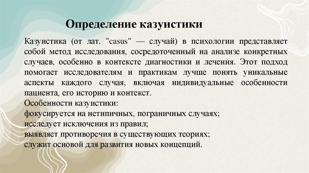Определение казуистикиКазуистика (от лат. "casus" — случай) в психологии представляет